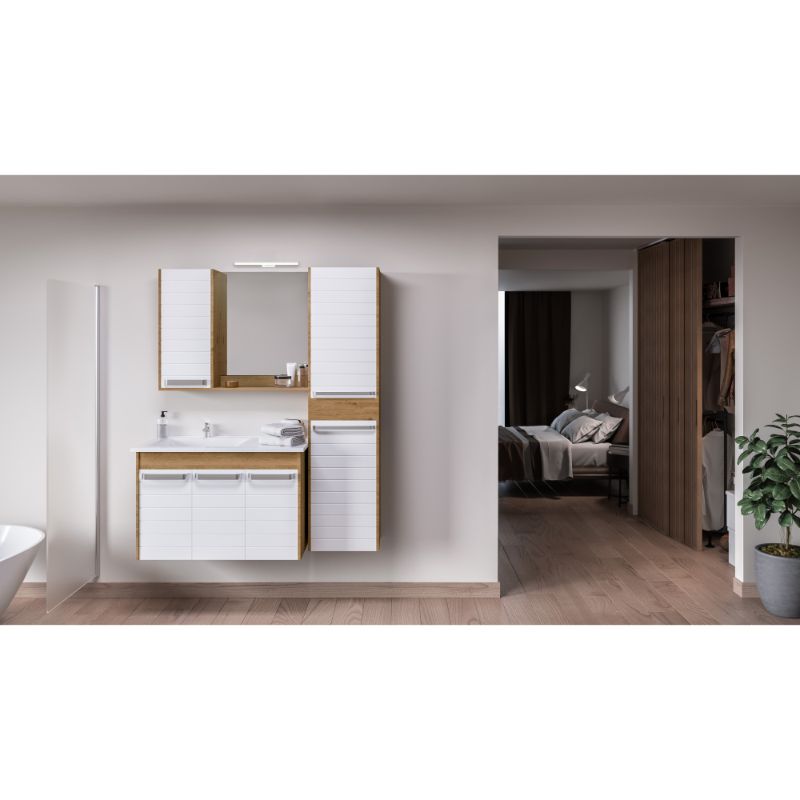 Ovaj ormarić karakteriše fantastičan spoj bele i boje drveta koji će se savršeno uklopiti u svako kupatilo i dati mu elegantan izgled. Vrhunski kvalitet izrade od medijapana i iverice. Lavabo je izrađen od polimermera, ili takozvanog veštačkog mermera velike otpornosti, što znači da je posebno otporan na oštećenja, hemikalije i toplotu. Izuzetna bela boja će pružiti osećaj blještavila i čistine, samim tim će učiniti da kupatilo izgleda mnogo svežije i prostranije. Vrata su obezbeđena sa sporo-zatvarajućim mehanizmom, kako bi se izbegla oštećenja.